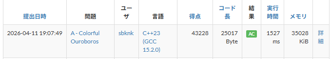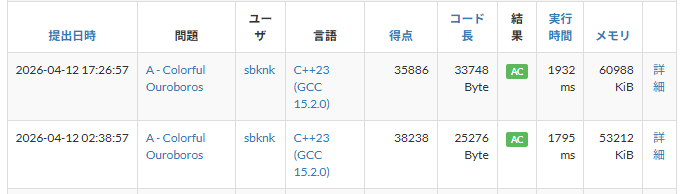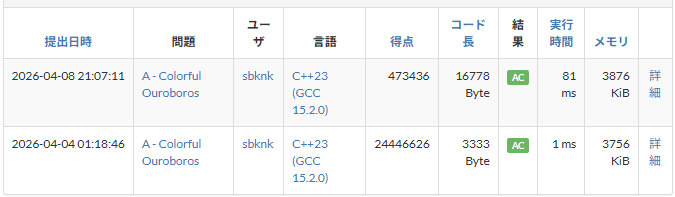 4/04の1:00頃の成績です自明解を改良しただけでこれだけ取れたのでまだ強い解を出している人が少なそう。 気落ちしなくていいね。 提出はこちら。