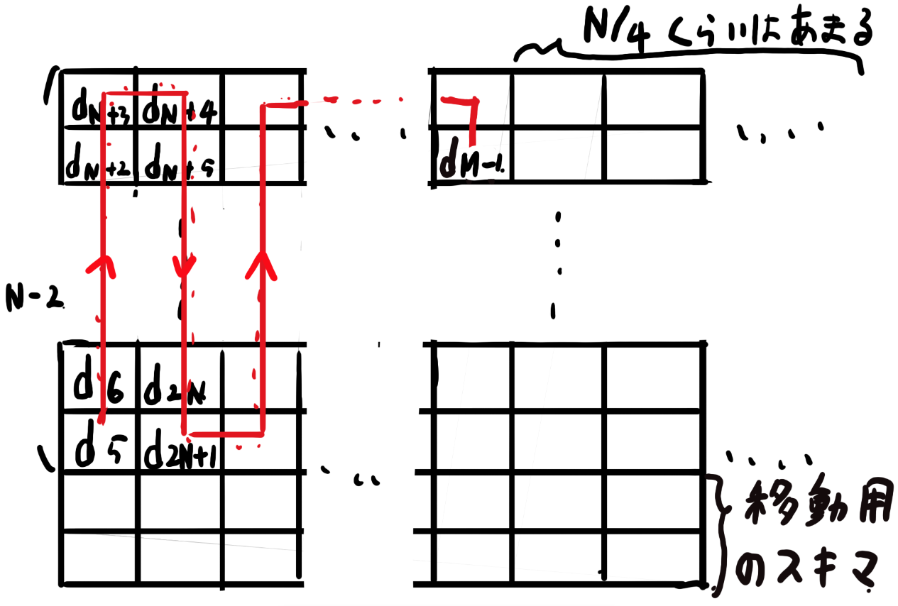 ただこれだと2つずつ詰めようとすると、Nが奇数の時に余りが発生して困ります。まぁこれはうまいことやれば詰め込めます。