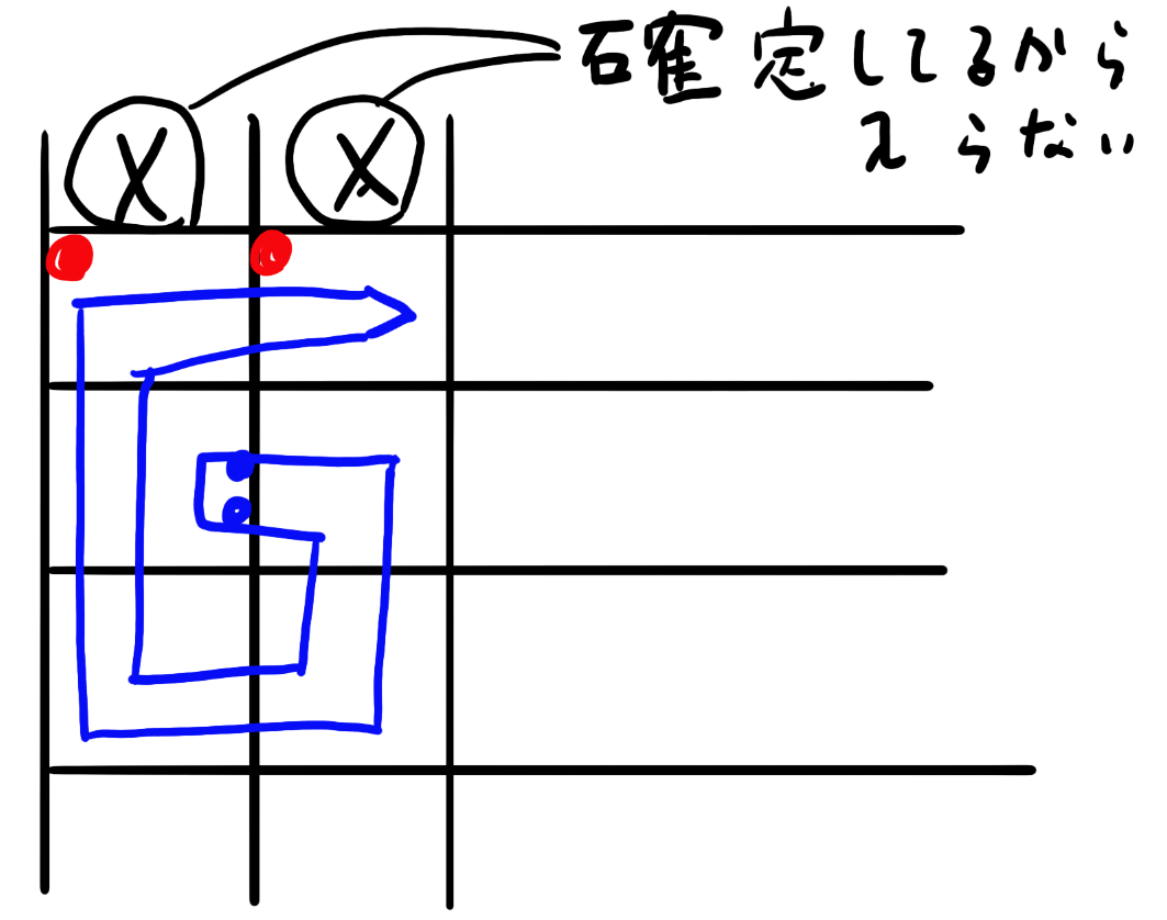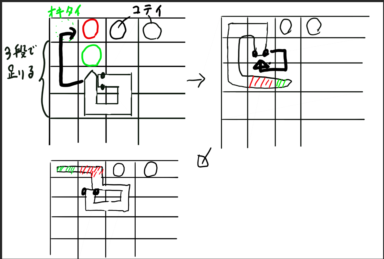 今回、始点となりうる蛇の頭の位置は置きたい列xに対してx+1だけなのでtx = 0として固定し、x=1となりました。あとは 餌の位置i j、蛇の頭の高さy、置きたい位置もtyを全探索しました。