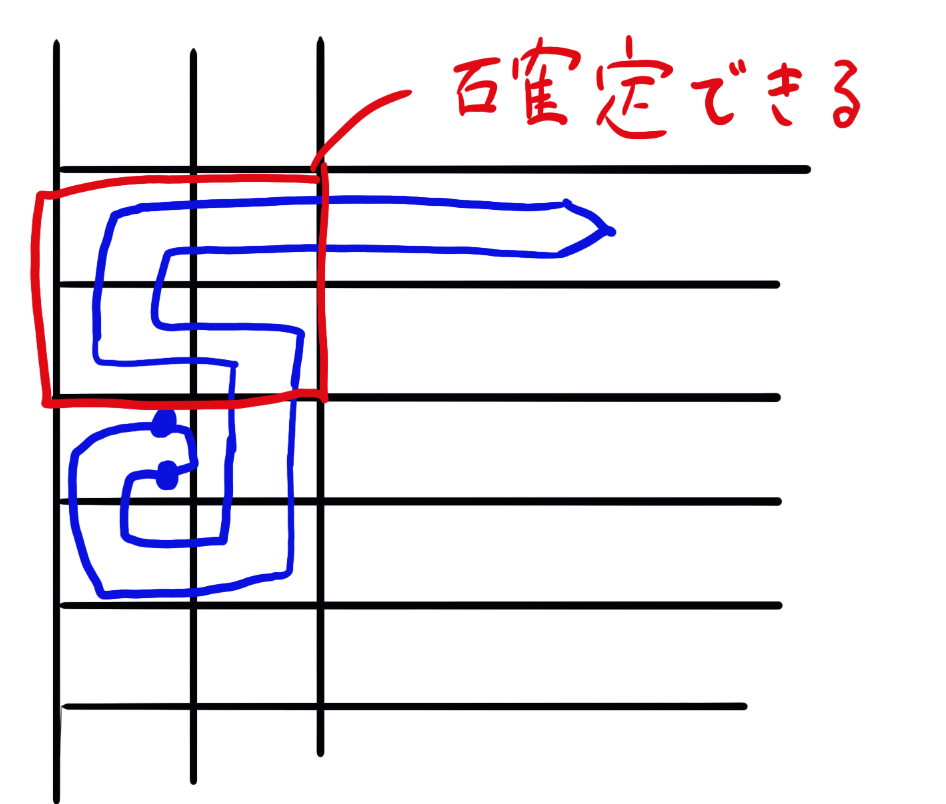 すこし上のマスはもう指定の色を置いているので立ち入らないこととします。6の字を作る場合影響はありません。水平に入ってくればいいので。