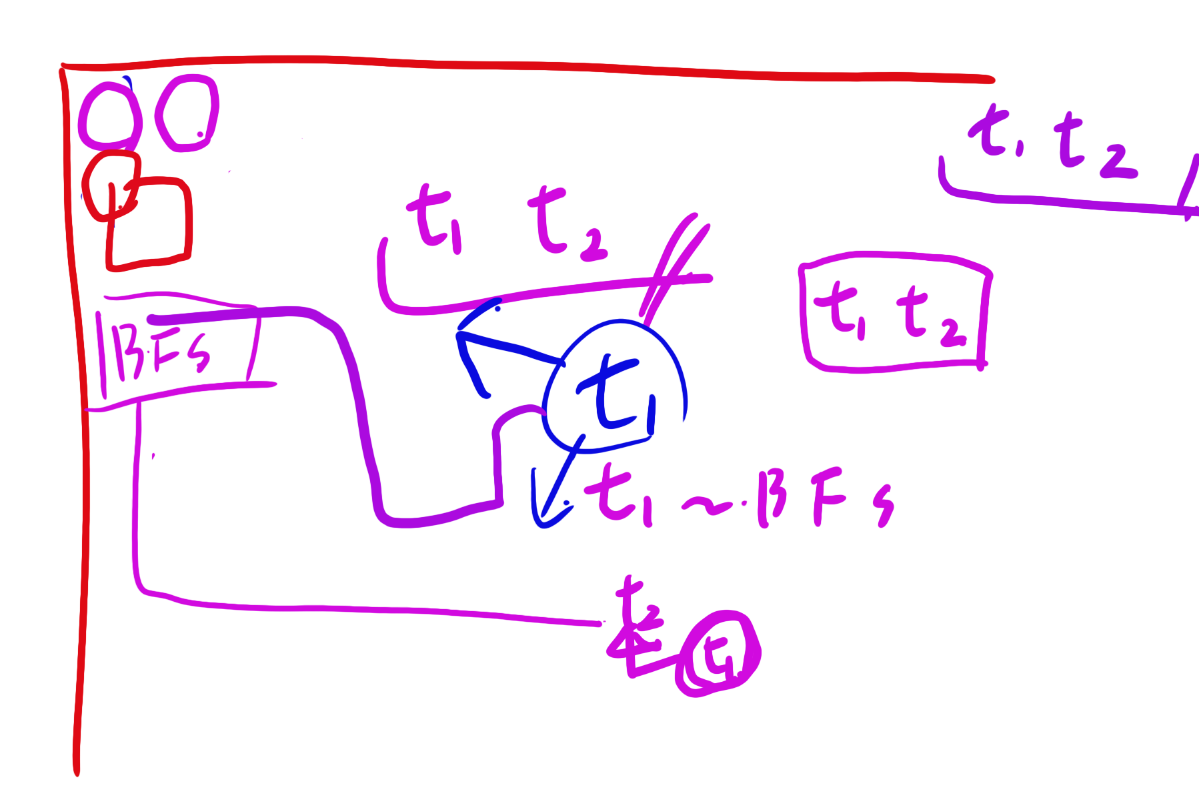 とりあえずおきたい色をt1,t2として、この2つを回収して左上のピンクの丸に行きたいなと思いました。とりあえずt1から始めて他の色を踏まずにt2に到達できるパターンを探してあげようと思います。