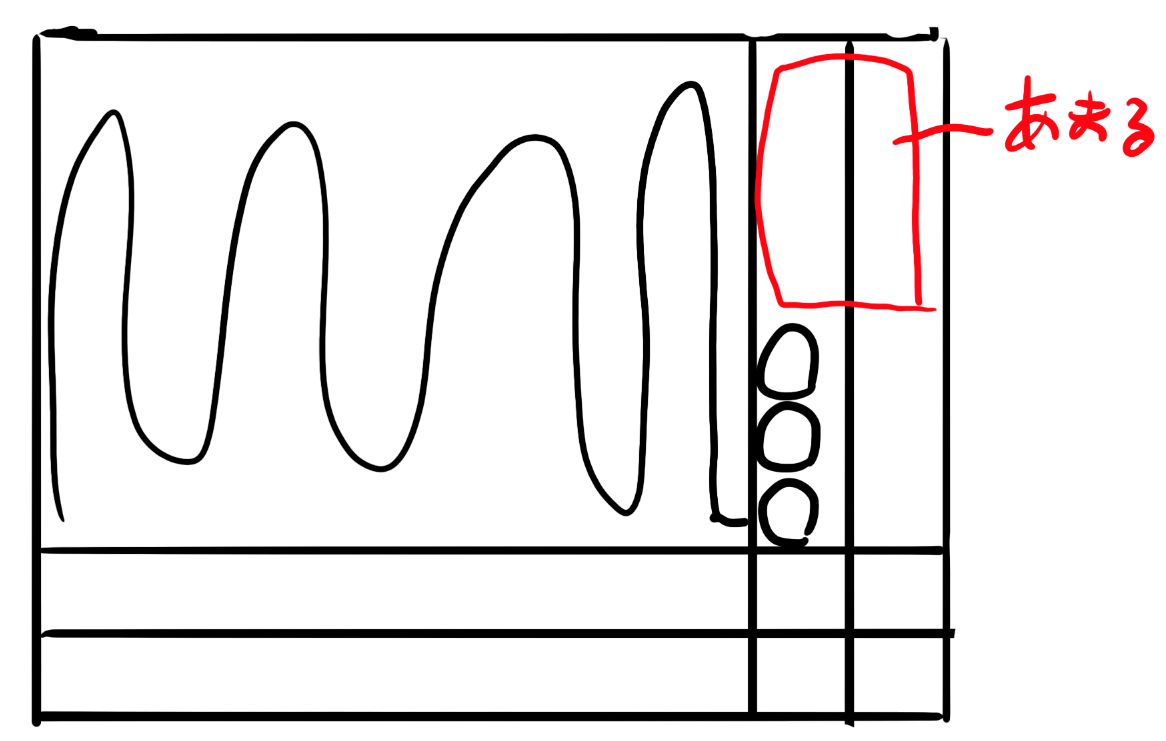 しかもよくよく考えると長方形を詰め切れない場合、下図のように片側だけ詰めるみたいなことが起こります。上に向かう途中で途切れるのが非常に困ります。上の方からパンパンに詰めていきたい。