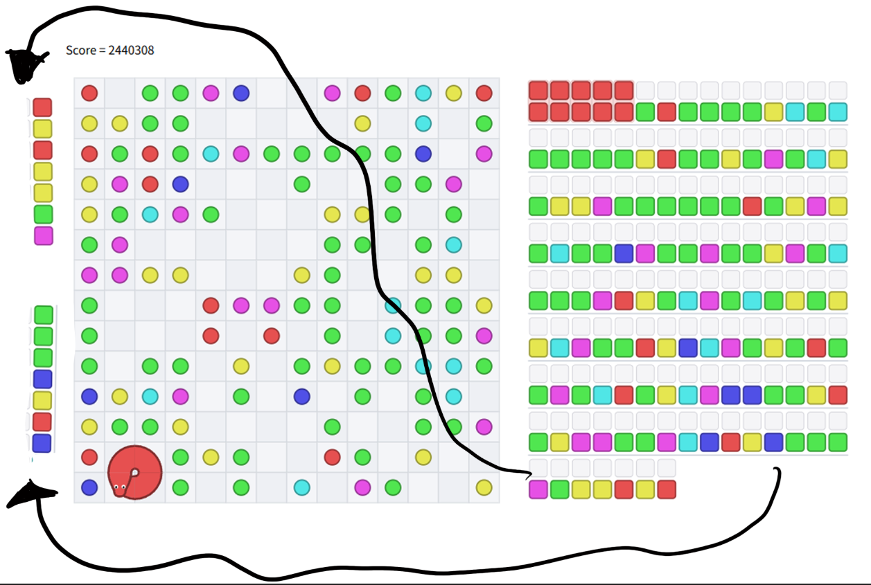 あとは欲しい色の隣に最後の一致を置くときに通るべき道を探すコストも高そう。上端から下端まで埋めて、噛み千切らないと次の移動ができません、とかは困る。