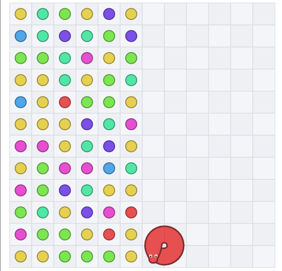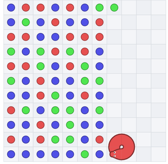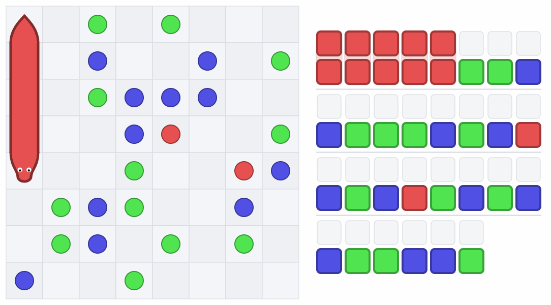 蛇が最終行の手前で餌を置き切ったときに新しい列に移動しますが、新しい列が最終行かつすべて正しい色で埋まっていた場合、蛇がその列の餌を食べないで終了していました。