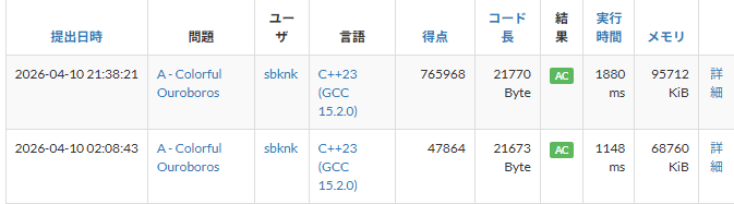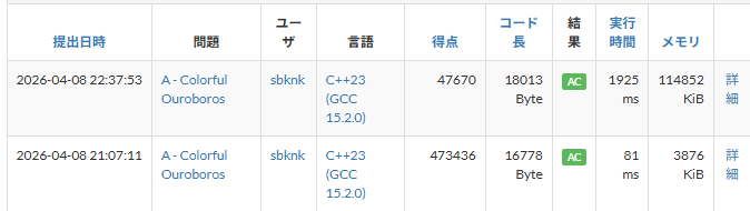 考察以外の内容としては、今回初めてビームサーチを実装しました。DFSしかやってませんでしたが、stateを作成すると大分簡単に作れることが分かったので今後の短期でも使えそうな気がします。よかったね。