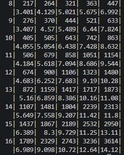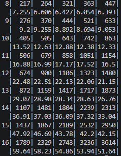 各Nに対して2行を用意して、上が平均、下がそれをN^2で割ったものです。 列は左から25~34,35 ~ 45と10%刻みでN^2に対するMの割合が増えるようになってます。